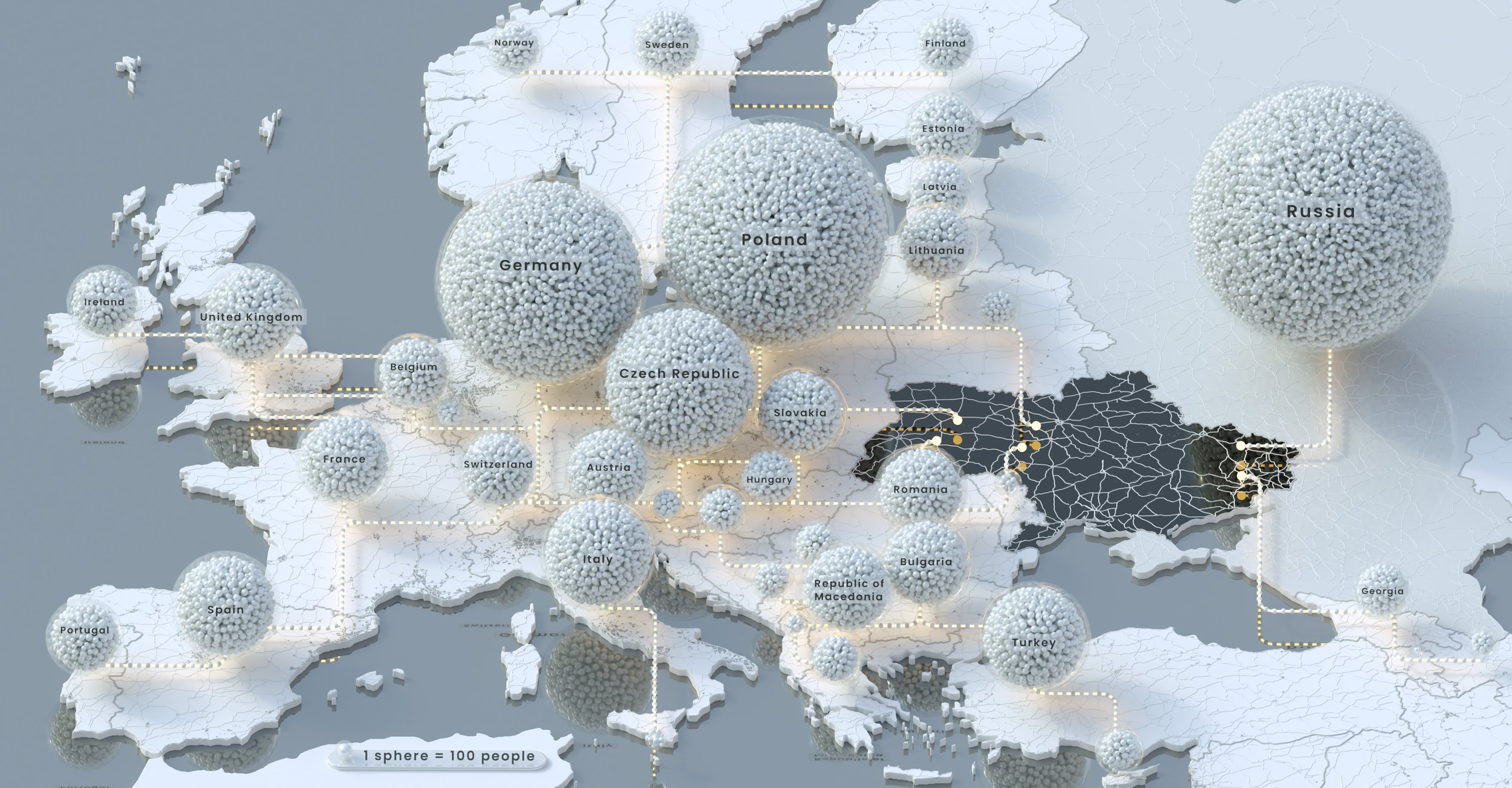The initial map was sound in concept and I think illustrated the scale of migration well but when discussing with The FT we concluded that it was a little too clinical with its glass network and, despite being Ukraine flag colours, the blues and yellows created a kind of medical feel to the overall map.